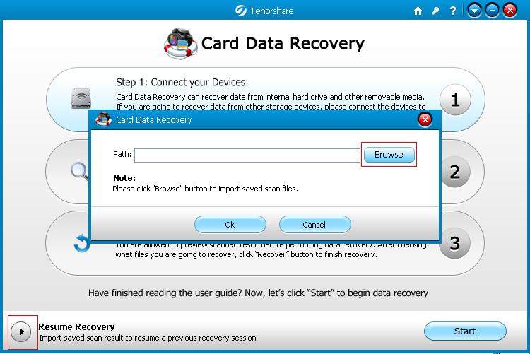 You can import the previous scan result and resume recovery without rescanning. Click the triangle on the home interface of this software and click "Browse" to import the scan result. Click "OK" to go on the next steps.