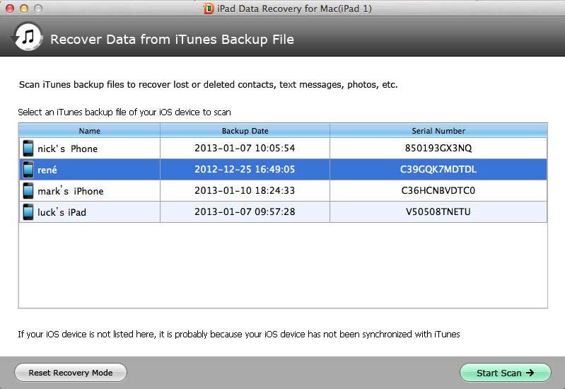 Once you launch the program, it will automatically load all iOS device backup on the program interface. Choose your iPad backup file and click "Start Scan". Make sure you have backed up your iPad on this computer, or there will be no backup file to extract.